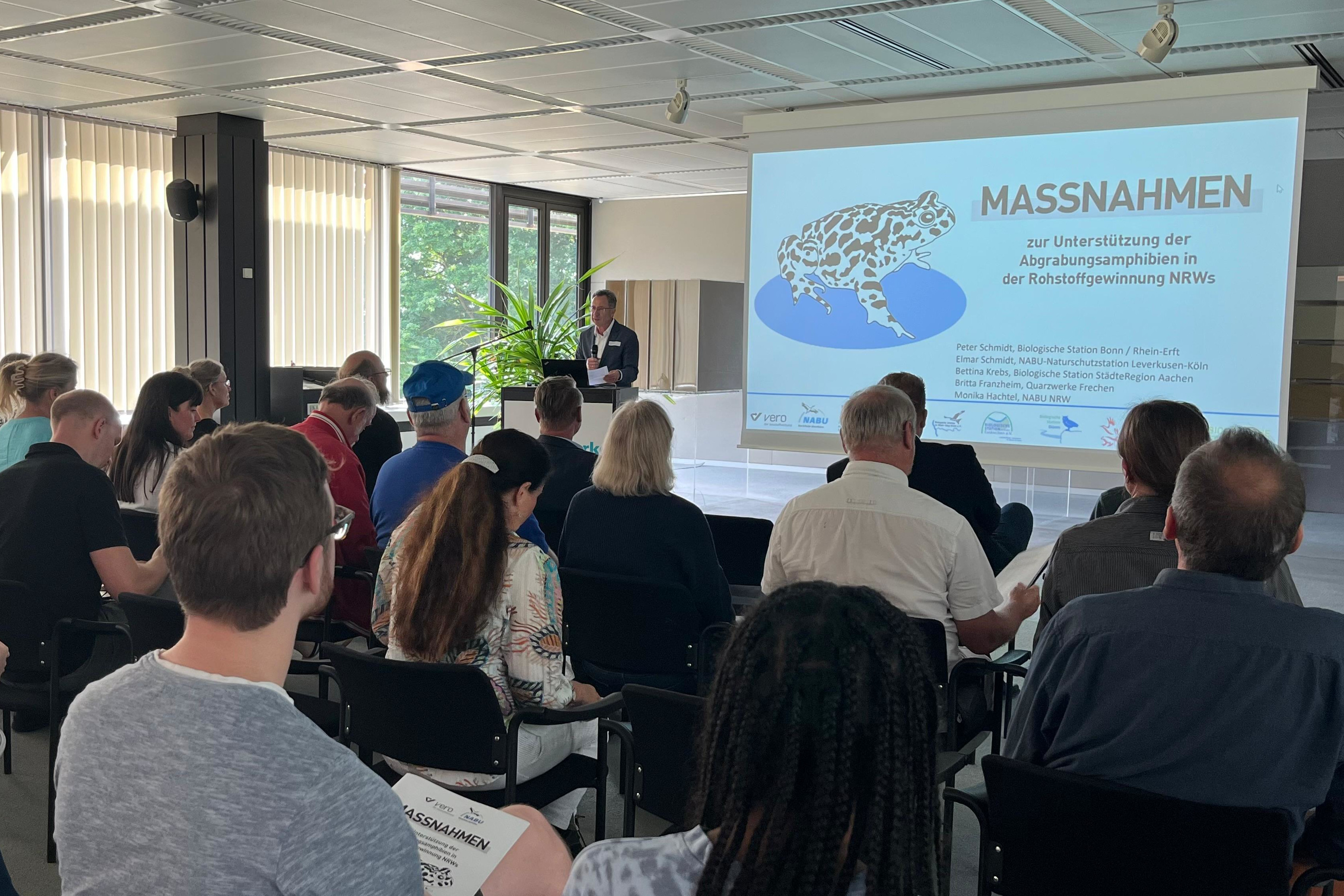 Um die bei der Rohstoffgewinnung entstehenden Ersatzlebensräume gezielt zu sichern und zu entwickeln, haben der NABU NRW, sieben rheinische Biologische Stationen und der Verband der Bau- und Rohstoffindustrie (vero) gemeinsam die Broschüre „Maßnahmen zur Unterstützung der Abgrabungsamphibien in der Rohstoffgewinnung NRWs“ in zweiter Auflage aktualisiert und veröffentlicht. Die Broschüre stellt konkrete, freiwillige Maßnahmen vor, mit denen Unternehmen ihre Betriebsflächen amphibienfreundlich z. B. für die Kreuz- oder Wechselkröte gestalten können, ohne den laufenden Betrieb grundsätzlich zu beeinträchtigen. Der Leitfaden richtet sich an Unternehmen, Behörden und Fachplanende. Er zeigt anhand praxisnaher Beispiele, wie Artenschutz in der aktiven Rohstoffgewinnung funktionieren kann. Flankierend zu den praktischen Maßnahmen verleihen vero, NABU und die Biostationen nach einigen Jahren konstruktiver Zusammenarbeit sowie erfolgreicher Stützung und Förderung der Amphibienbestände die Plakette „Amphibienfreundlicher Betrieb“.